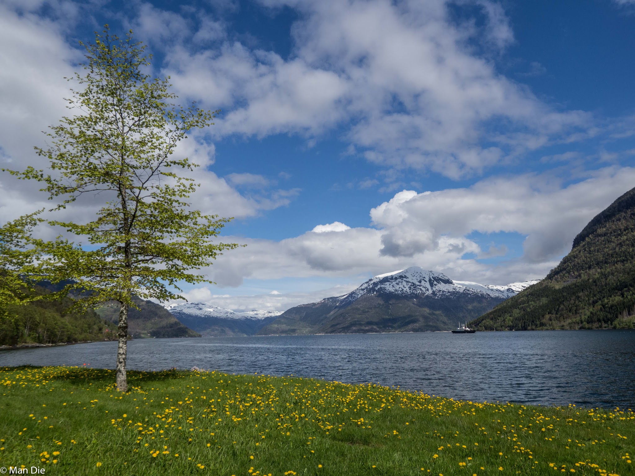 Die Abfahrt des Schiffes verzögerte sich erheblich, da eine Reisegruppe irrtümlich auf das Schiff gelangt war. Es dauerte einige Zeit, bis Alle den Irrtum bemerkt hatten und das Schiff wieder verließen. Eingekeilt zwischen bis zu 1800m hohen Bergen folgte das Schiff dem Fjord. An den Hängen gab es viele Wasserfälle zu bestaunen, die die Felsen hinab stürzten. Am Fjord liegen einige kleine Siedlungen, die auch heute noch nicht mit dem Auto erreicht werden können. Der Wasserweg ist die einzige Verbindung zur Aussenwelt.