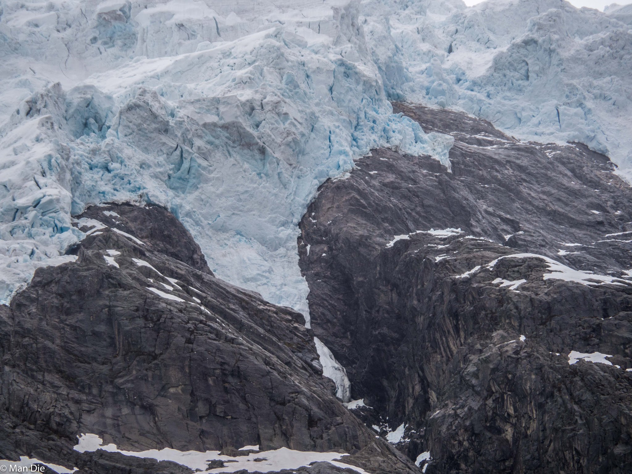 Auf dem Parkplatz legten wir gleich die Mittagspause ein, um das nächste Regenschauer abzuwarten. Es klappte und wir konnten die wenigen Meter bis zum besten Gletscherblick trocken hinter uns bringen. Direkt unterhalb der Eismassen war gut zu erkennen, dass immer wieder Eismassen vom Gletscher herabstürzen.