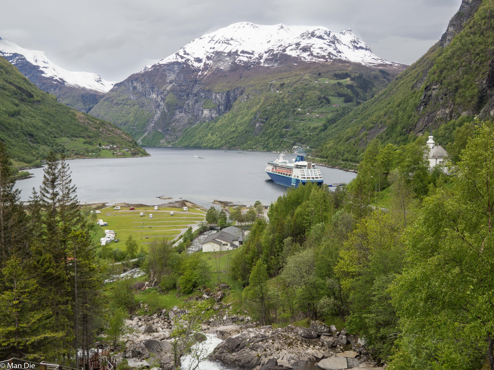 Am Morgen, gleich nach dem Aufstehen, erlebten wir eine Überraschung. Zuerst fielen uns eine große Zahl von Reisebussen auf, die in der Nähe des kleinen Campingplatzes parkten. Den Grund entdeckten wir während des Frühstücks. Die Empress, ein Kreuzfahrtschiff mit 1800 Passagieren, legte im kleinen Hafen von Hellesylt an, um Passagiere auf einen Landausflug zu entlassen.