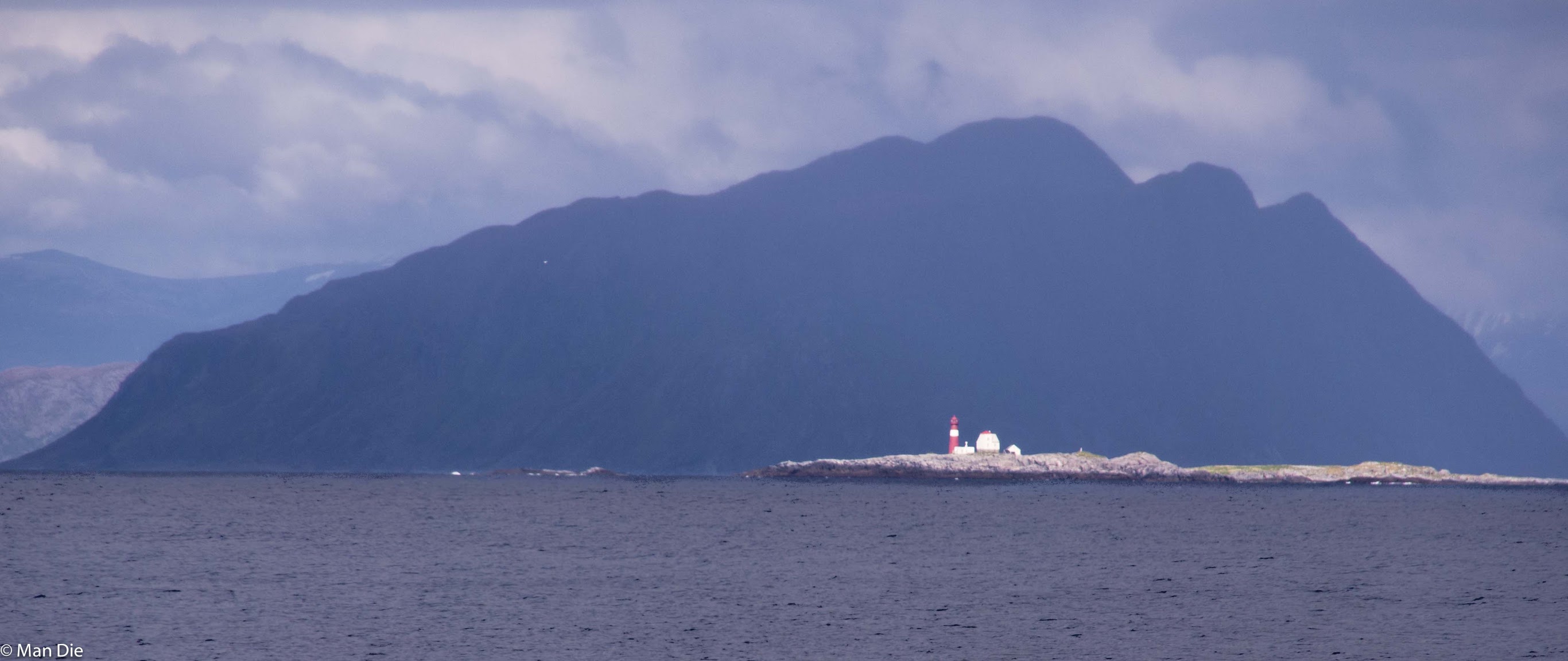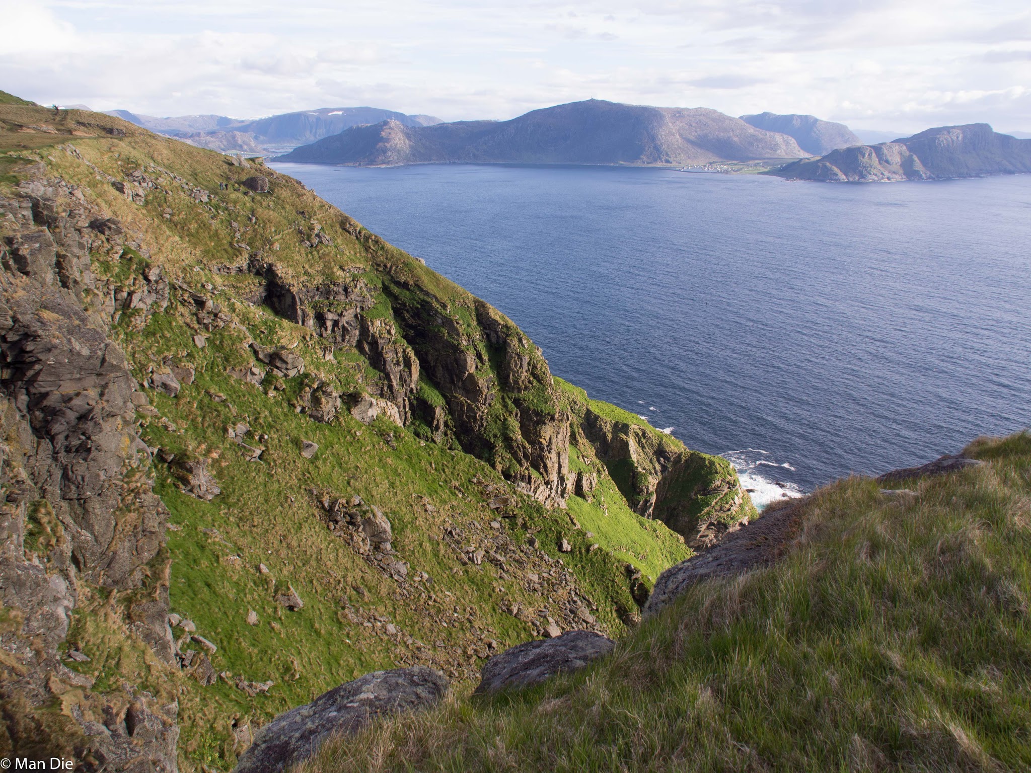 Nach einem kleinen Nachmittagsschläfchen und der obligatorischen Kaffeepause nahmen wir den steilen Aufstieg in Richtung Vogelfelsen in Angriff. Es ging steil bergauf. 300Höhenmeter waren auf sumpfigen Moorboden zu überwinden. Durch unsere fehlende Ortskenntnis machten wir einen großen Umweg, der uns aber tolle Ausblicke auf die Insel und die norwegische Küste bescherte. Hinzu kam, dass einzelne kleine Regenschauer vorbeizogen. Die Lichtstimmung wechselte im Minutenabstand.