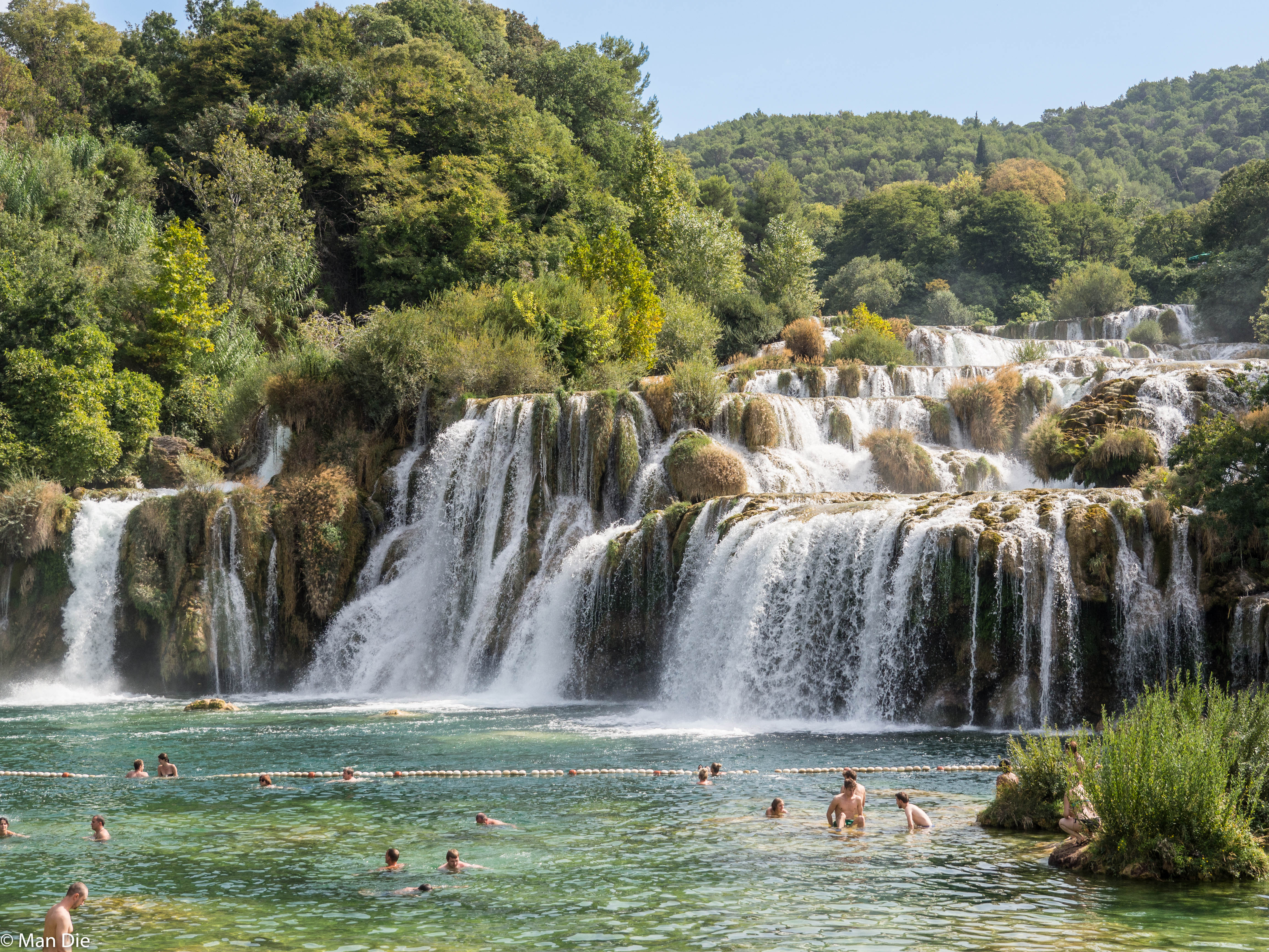 Im Nationalpark führten uns Holzstege über den Oberlauf der Krka, kurz bevor sich die Wassermassen die Kaskaden hinunterstürzen. So erlebten wir die Gegensätze zwischen dem kargen Umland und dem grünen Tal der Krka. Von einem Aussichtspunkt konnten wir gut unsere vor über 30 Jahren genutzten Badestellen erkennen, bevor der Abstieg zum Fuß der Fälle begann.